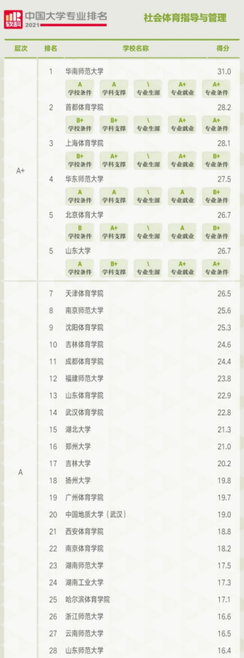 在社会体育指导与管理专业排名中,共有146所高校上榜,A+层次的高校依次为华南师范大学、首都91直播 、上海91直播 、华东师范大学、北京体育大学、山东大学。